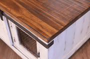 Pueblo cocktail table features solid pine. Two-tone, multi-step finish in white or black and brown top. Mortise and tenon construction. Sliding doors with gliding mechanism and mesh doors. Functional doors on both sides of cocktail table for convenient and accessible storage. Custom pulls with non-chip finish. Hidden casters for easy mobility. ***Priced for cocktail table only, other items sold separately.***