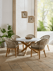 The Shenandoah Dining Table combines functionality and elegance with its Polystone tabletop and natural teak legs. Polystone, known for its durability, is perfect for light or daily use. Seating up to five, this table is perfect for gatherings. Priced for the table only, additional pieces sold separately.