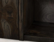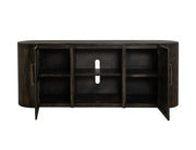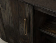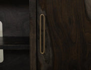 With two side doors offering hidden storage and an open center section with fixed shelving and built-in wire management, this piece is as functional as it is beautiful. Mortise and tenon construction ensures lasting strength, while magnetic catches and custom metal handles with a non-chip finish add subtle, refined details. Whether used in a living room or entryway, this console makes a warm, modern statement.