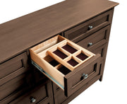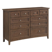 The furniture is constructed in traditional fashion, yet still maintains a modern look by incorporating current colors and styles. Crafted from environmentally-friendly American Alder hardwood, it utilizes full extension metal ball bearing drawer slides and English dovetail drawer construction for smooth operation. The use of mortise and tenon joinery ensures durability and stability throughout usage. Additionally, dust bottoms are included in all cases and fitted backs provide structural strength. The feet are equipped with adjustable levelers for even placement. Available finishes are showcased on all pieces. As an added safety measure, chests and dressers have an anti-tip mechanism compliant with ASTM standards to prevent tipping.