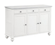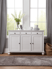 The Seaside Buffet gives you a coastal look and a place to store your dining room essentials. This piece includes three full extension drawers, three adjustable shelves and upgraded hardware. Made with durable and ecofriendly Parawood from the Hevea Tree. It is available in the manufacturer's finish of Chalk and White.